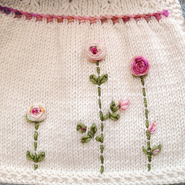 The pattern is called Alouette, designed by Lisa Chemery. She also designed Entrechat, my favorite sweater for baby girls and Elevenses, my favorite sweater for baby boys. I decided I needed to jazz this up if I wanted the blue ribbon, so I added the embroidered roses. I was very pleased to get the blue!