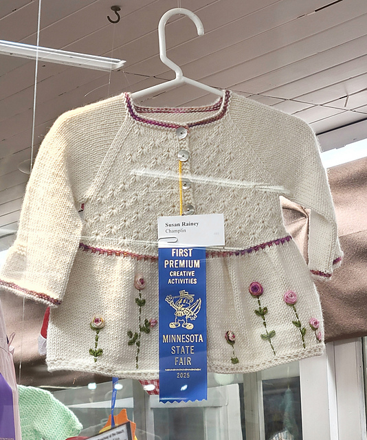 I did attend the state fair this year and did enter some knitting. It was not the best year I’ve ever had. I did win a few ribbons, one of which was blue. It was for this little sweater I made for a good friend who is also a knitter. It had to be special and I wanted a blue ribbon on it to attach to the gift.