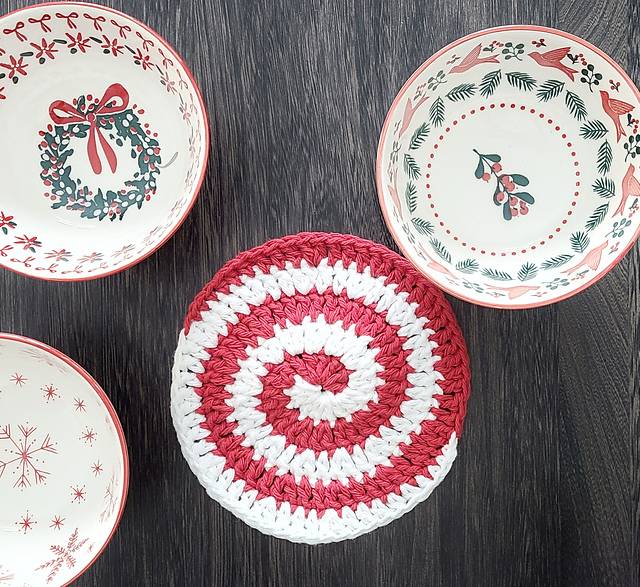 Another Drops design! This “Holiday Swirls” spiral crochet coaster or potholder is really quick. However, I could not make heads or tails out of the Drops chart!! I searched “two color crochet spiral” and found a simple video that walked me through it. I added the tapering and describe it on my Ravelry project page.