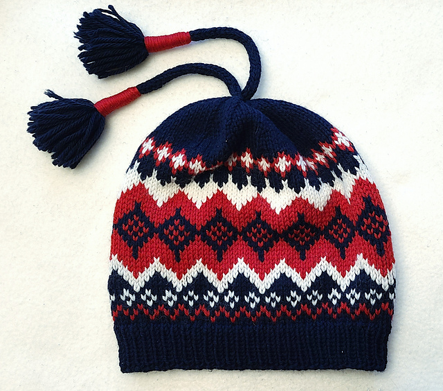I charted it to minimize the jog. It’s not perfect, but it’s pretty good. The pattern is free on Ravelry and is knit with three colors of Cascade 220 yarn. It basically has four size options. Please excuse the weird formatting of our recent posts. They changed the software and it is really hard to use and looks terrible!!